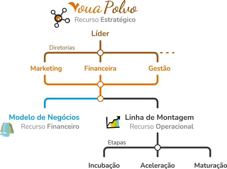 Este fluxo contínuo de recursos é estrategicamente orquestrado pela Estrutura Organizacional VouaPOLVO e viabiliza a Linha de Montagem Voua, nosso processo de transformar ideias em empreendimentos.